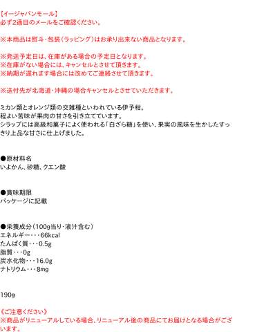 ●原材料名 いよかん、砂糖、クエン酸 ●賞味期限 パッケージに記載 ●栄養成分(100g当り・液汁含む) エネルギー・・・66kcal たんぱく質・・・0.5g 脂質・・・0g 炭水化物・・・16.0g ナトリウム・・・8mg 190g【メーカー・製造または販売元】国分グループ本社株式会社0120-417592【広告文責】株式会社イージャパンアンドカンパニーズ 072-875-6666《ご注意ください》 ※商品がリニューアルしている場合、リニューアル後の商品をお届けします。