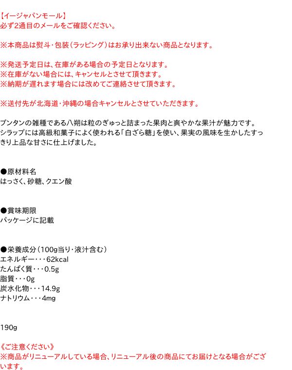 ●原材料名 はっさく、砂糖、クエン酸 ●賞味期限 パッケージに記載 ●栄養成分(100g当り・液汁含む) エネルギー・・・62kcal たんぱく質・・・0.5g 脂質・・・0g 炭水化物・・・14.9g ナトリウム・・・4mg 190g【メーカー・製造または販売元】国分グループ本社株式会社0120-417592【広告文責】株式会社イージャパンアンドカンパニーズ 072-875-6666《ご注意ください》 ※商品がリニューアルしている場合、リニューアル後の商品をお届けします。
